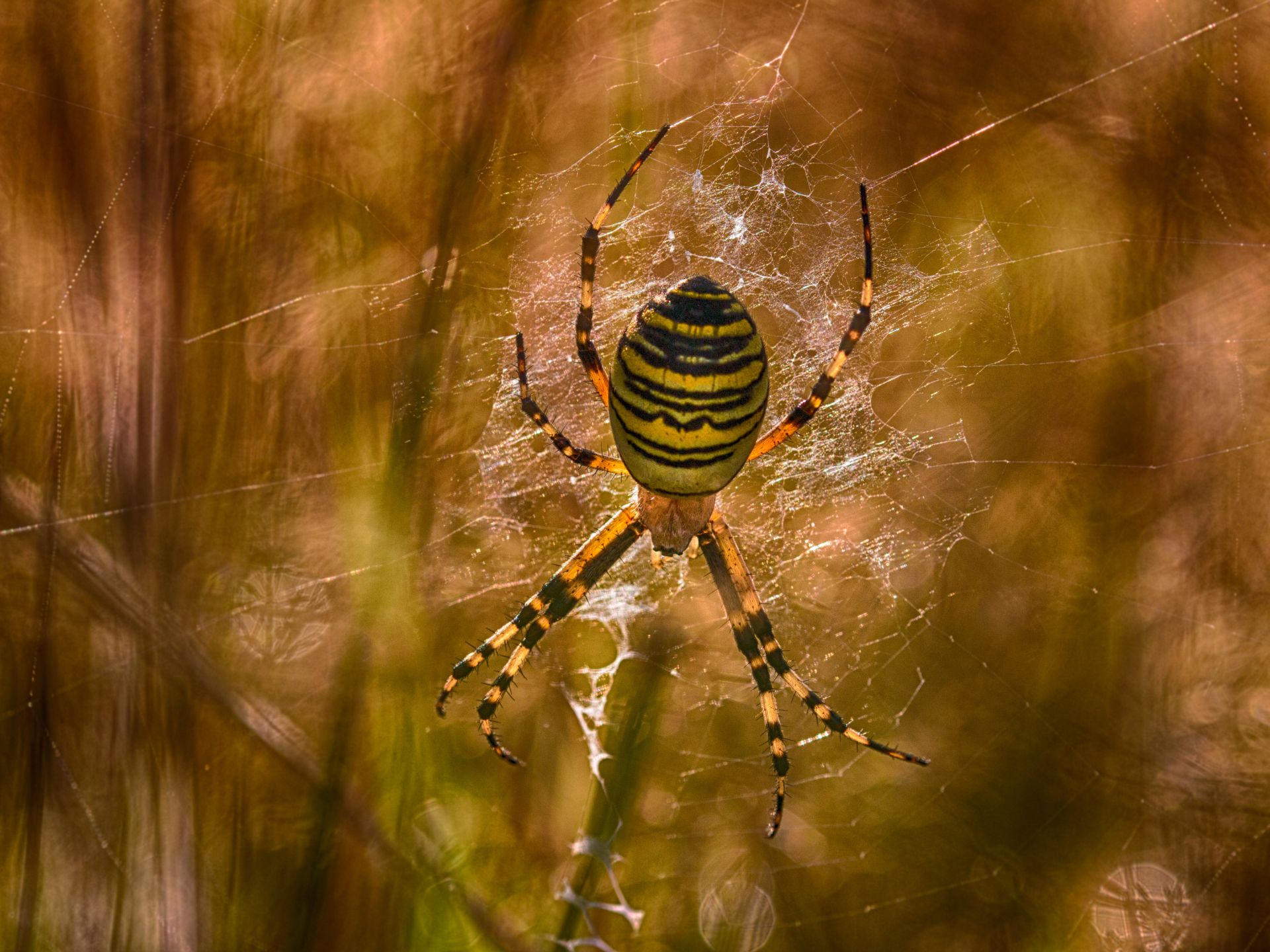 Die Wespenspinne (Argiope bruennichi) aus der Familie der Echten Radnetzspinnen, ist mittlerweile in fast allen europäischen Ländern zu finden. Seit rund 50 Jahren breitet sich die wärmebevorzugende Art immer weiter nach Norden aus. Wegen der schwarz-gelben Färbung ihres Hinterleibes gilt die Wespenspinne als eine der auffälligsten und schönsten heimischen Spinnen. Die Färbung erinnert an eine Wespe (Name!). Die Nachahmung eines gefährlichen Tieres, in diesem Fall einer Wespe, nennt man Mimikry. Wespenspinnen leben vorzugsweise auf strukturreichen, wärmebegünstigten Wiesen.