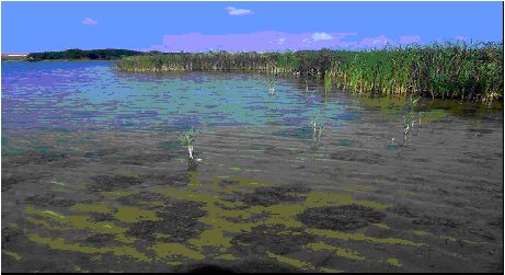 Der Feisneck-See bei Waren/MÜR im Müritz-Nationalpark mit Nixkraut-Filzarmleuchteralgen-Grundrasen (4.2.1.2). Im Vordergrund sind Mittleres Nixkraut (Najas marina ssp. intermedia), im Hintergrund Schmalblättriger Rohrkolben (Typha angustifolia) am Rand des Röhrichtes zu sehen (W. Wiehle 7/1998).