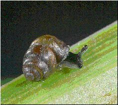 Bauchige Windelschnecke (Vertigo moulinsiana) an Sumpf-Segge (Carex acutiformis)(V. Wiese, Haus der Natur Cismar 5/2003)